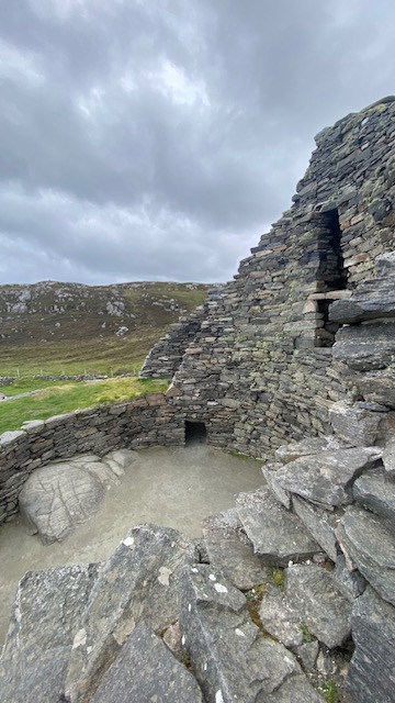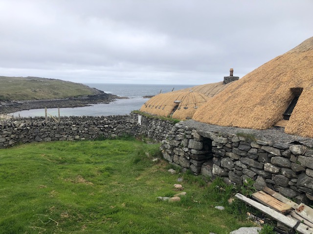 Hinreichend geräuchert durch das Torffeuer im Blackhouse, atmen wir in der Blackhouse-Ruine draußen erstmal auf bzw. tief ein und aus. Nun begrüßen wir den Wind. Immer noch ein wenig benommen, schieben wir uns durch das feuchte Whitehouse.