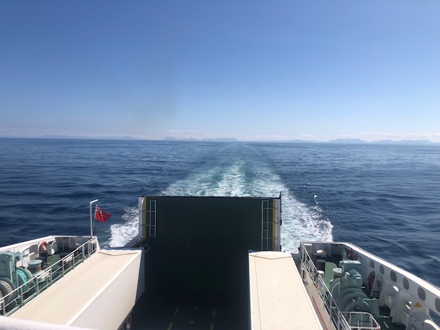 Die Sonne blinzelt sich unerbittlich durch jede Ritze unserer abgedunkelten Schlafkoje. Mein Gefühl und ein Blick nach Draußen lässt mich jäh aufschrecken: wir haben verschlafen! Ein Blick auf die Uhr und ich krieche wieder zurück in die Koje. 6:10 Uhr und die Sonne steht hoch am Himmel. Viel Schlaf gibt es nicht mehr, wir positionieren uns früh am Ableger und kochen vor Ort Kaffee, bevor wir abermals das Gas abdrehen. Der unglaubliche blaue Himmel und die wärmende Sonne begleitet uns den gesamten Tag. Unmengen von Wohnmobilen finden sich vor der Fähre ein. Viele haben wir gestern bei unserem abendlichen Rundgang über den Platz schon gesehen. In Michaels Gedanken entsteht die Vision, dass wir niemals ein Rückfahrtticket bekommen und wir drei Wochen auf den Inseln ‚fest sitzen‘. Also recherchiert er eine Rückfahrt-Möglichkeit während ich arglos meinen Kaffee in der Sonne genieße.