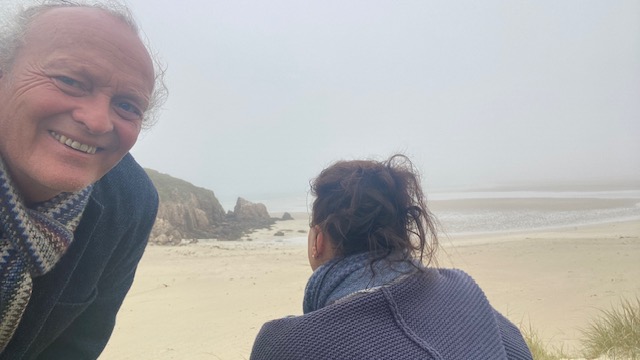 Auch wenn der Nebel über dem Meer schwebt, funkelt es uns doch ein wenig türkis entgegen. Auch wenn die Temperaturen mich jetzt vom Schwimmen abhalten, möchte ich dennoch das kühle Nass des Atlantiks spüren und stapfe über den Strand.