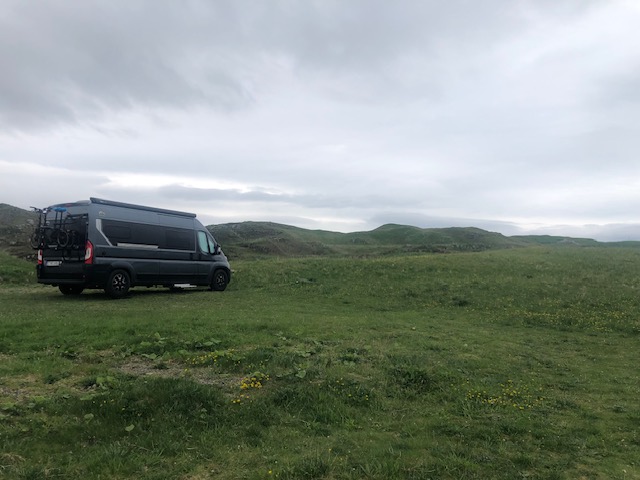 Michael kümmert sich wie so häufig um den Abwasch, damit ich ein wenig die Fotos sichten und runterladen kann. Er vergisst Spüli und Lappen, bekommt beides von einer freundlichen schottischen Lady und kommt, wie das hier so ist, sofort mit ihr ins Gespräch. Eigentlich wollte ich, sobald wir am Strand stehen, schwimmen gehen aber bei 10 Grad überlege ich nicht lange und schreibe lieber ein wenig. Obwohl die Sonne ein wenig durch die Wolken blinzelt als ich Kaffeewasser für unseren morgendlichen Kaffee hole, zieht Michael die kuschelige Wärme von unserem Bus vor.