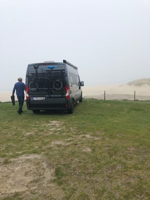 Wir nehmen weiterhin das Wetter wie es kommt, wie alle anderen Camper auch. Einige sind tatsächlich mit dem Fahrrad und Zelt unterwegs. Stellen wir uns zu den Anderen, windgeschützt und nahe zum Sanitärhaus? Auch wenn der Wind noch einmal zunimmt und ein bißchen Regen sich mit der Gischt aus dem Meer vermischt, suchen wir uns einen Platz am Wasser. Ich fotografiere die Reservierungsliste, die bei Finn an der Rezeption im Fenster hängt. Die geraden Plätze mit Blick auf dem Strand sind fast alle reserviert. Aber nur fast. Kleine Unebenheiten gleichen wir mit unseren Keilen aus.