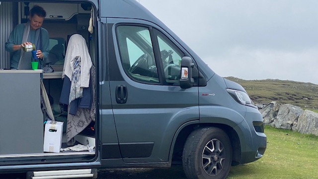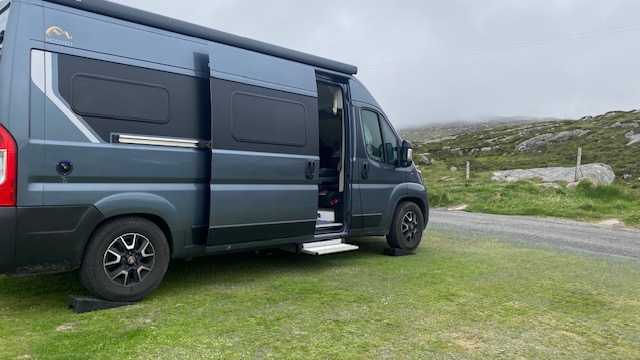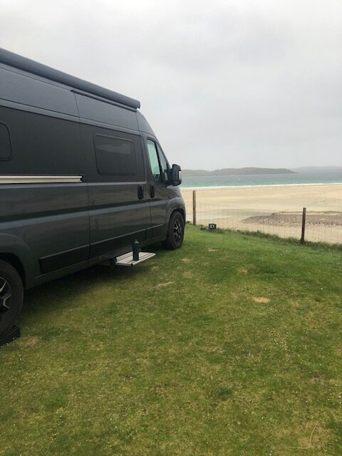 zu einem weiteren großen Strand, dem Scarista Beach und unserem Platz für die Nacht, dem Horgabost Campsite. Die Sonne verführt uns, den Abend vor dem Bus ausklingen zu lassen.