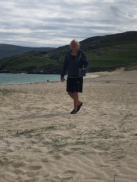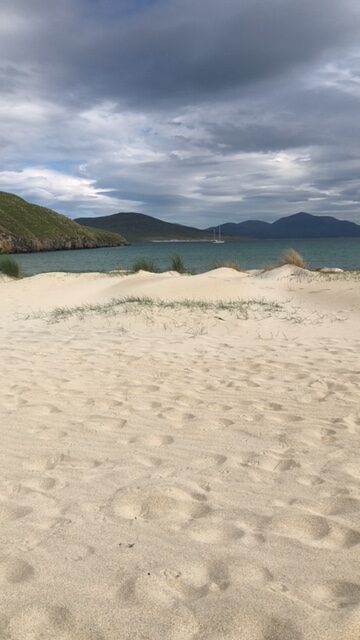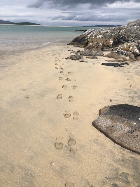 Die Sonne kämpft immer noch hinter dem wolkenverhangenen Himmel. Dies schmälert nicht den Ausblick aus dem Seitenfenster: das Meer liegt friedvoll und wunderschön vor uns. Die Insel Harris überbietet sich selbst mit wunderschönen Stränden. Mich zieht es noch einmal hinunter zum Strand, um ein paar vergängliche Spuren zu hinterlassen. Michael kümmert sich um unseren Bus und beseitigt ein paar Spuren.
