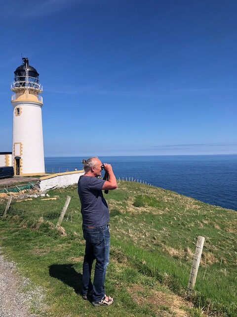 Michael rüstet sich mit unserem neuen Fernglas aus und wir beobachten, die sich auf dem Wasser und in der Luft tümmelnden Vögel – Basstölpel.