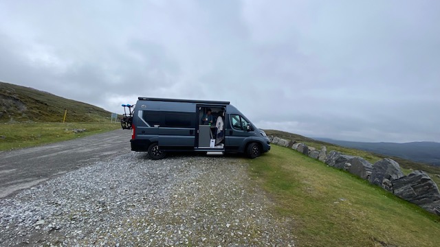Heute ist Regenjacken-Tag + alles darunter anziehen, was möglich ist. 10 Grad, Wind und vereinzelte Tropfen Regen. Eigentlich Gründe, um ein Weilchen länger die warme Koje zu genießen. Aber wir müssen unseren Platz vor 10:00 Uhr verlassen. Ich beginne, den Bus startklar zu machen, während Michael wieder einmal seine Superkraft nutzt. Kein Klappern und Umräumen holt ihn aus dem Schlaf. Erst als der Kaffeeduft durch den Bus zieht, regt sich etwas im hinteren Teil des Busses. Einige Handgriffe sind noch zu tun und da ich ein bißchen wacher bin, übernehme ich die erste Fahrstrecke.