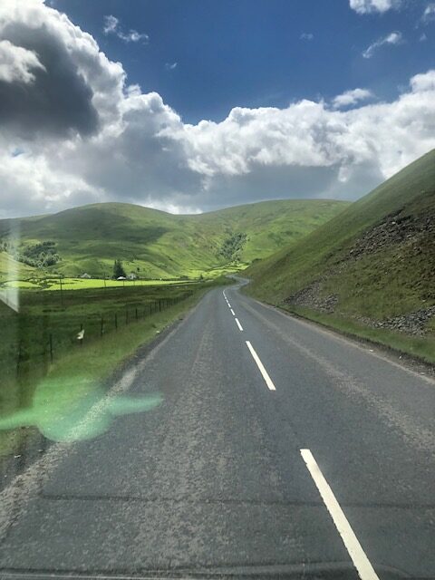 Es ist wunderbar ruhig am Morgen und wir dämmern aus dem Schlaf in unsere morgendliche Routine. Es schleicht sich ein wenig Wehmut in unsere Gedanken: dies war der letzte, emotionale Platz auf unserer Reise. Ab jetzt sind wir zweckmäßig auf dem Rückweg. Trotzdem nehmen wir alles mit, was der Wegesrand und die ‚Slow Road‘ zu bieten hat. ‚Slow Road‘ ist das Stichwort: ich navigiere, Michael fährt. Immer wenn die Straßen kleiner werden, kommentiere ich die Schönheit der Landschaft, während Michael achtsam um die Schlaglöcher – zum Glück gibt es wenig Gegenverkehr – herum schlingert. Aber es gibt Arbeiten am Wegesrand – irgendwer muss sich ja um die Befahrbarkeit dieser kleinen Straßen kümmern. Während wir langsam näher kommend anhalten, weicht schweres Gerät in die grünen Hügel und wir touchieren leicht mit unserem Rückspiegel das Fahrzeug. Der Schotte auf der Straße in orangefarbener Weste deutet an, dass wir anhalten sollen. Mit zerknirschter Miene fahre ich das Fenster herunter, in der Erwartung auf eine wütende Schelte. Doch dieser Schotte spricht uns auf das EM-Spiel am Freitag an. Völlig verdattert starre ich ihn sprachlos an. Michael ist schneller und retourniert. Ich lache schließlich erleichtert und sage, dass die Schotten durchaus eine Chance haben. Der freundliche Schotte schüttelt skeptisch den Kopf. Michael meint, das deutsche Team sei nicht in bester Verfassung (condition). „The scottisch has no condition“, lacht unser Gegenüber. Voller Stolz gibt er uns noch ein paar Tipps dieser Umgebung, welche wir entdecken können. Voller Stolz erzählen wir, was wir alles entdeckt haben und wie begeistert wir von dieser Region sind. Wir trennen uns mit wohlmeinenden Worten. Ich liebe die Schotten.