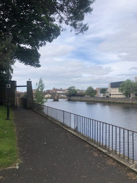 Die breite Straße bereitet keine Probleme. Die zunehmenden Kreisverkehre, je näher wir uns Ayr nähern, erlebe ich hin und wieder als Herausforderung. Wie immer steht mir Michael mit seinen Hinweisen hilfreich zur Seite. Am Fluß, einen kurzen Fussmarsch von unserem ersten Ziel entfernt, finden wir einen geeigneten Parkplatz für unser Baby. Während ich energisch die Handbremse anziehe, lobt Michael sich zunächst selbst, er hätte nicht viel gekreischt heute, und schließlich auch mich: ich hätte erstklassig eingeparkt. Was will man mehr.