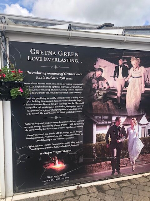 Unser Ziel: Gretna Green. Der Ort hinter der schottischen Grenze, wo die Ehen vieler englischer Pärchen seit Jahrhunderten geschlossen wurden und werden. Bei unter 21jährigen bedurfte es in England der Zustimmung der Eltern. Die Schotten ließen Eheschließungen bei Jungen mit 14 und Mädchen mit 12 Jahren zu. Also ab über die Grenze zum ‚Blacksmith-House‘, zum Schmied, der sich für das Glück der zukünftigen Paare verantwortlich zeigte.