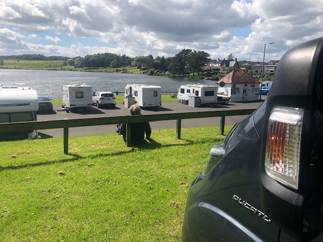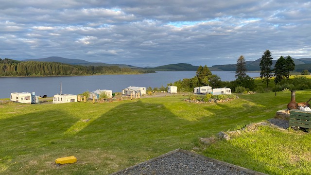 Dort bekommen wir ‚lediglich‘ einen Platz ohne Strom auf dem Hügel mit Blick auf das Loch. Etwas abseits vom Getümmel, was wir sehr begrüßen als sich Abends der Platz mit lärmenden Engländern füllt. Immer wieder blinzelt die Sonne durch die Wolken und lässt ihre Strahlen glitzern über das Wasser wandern.